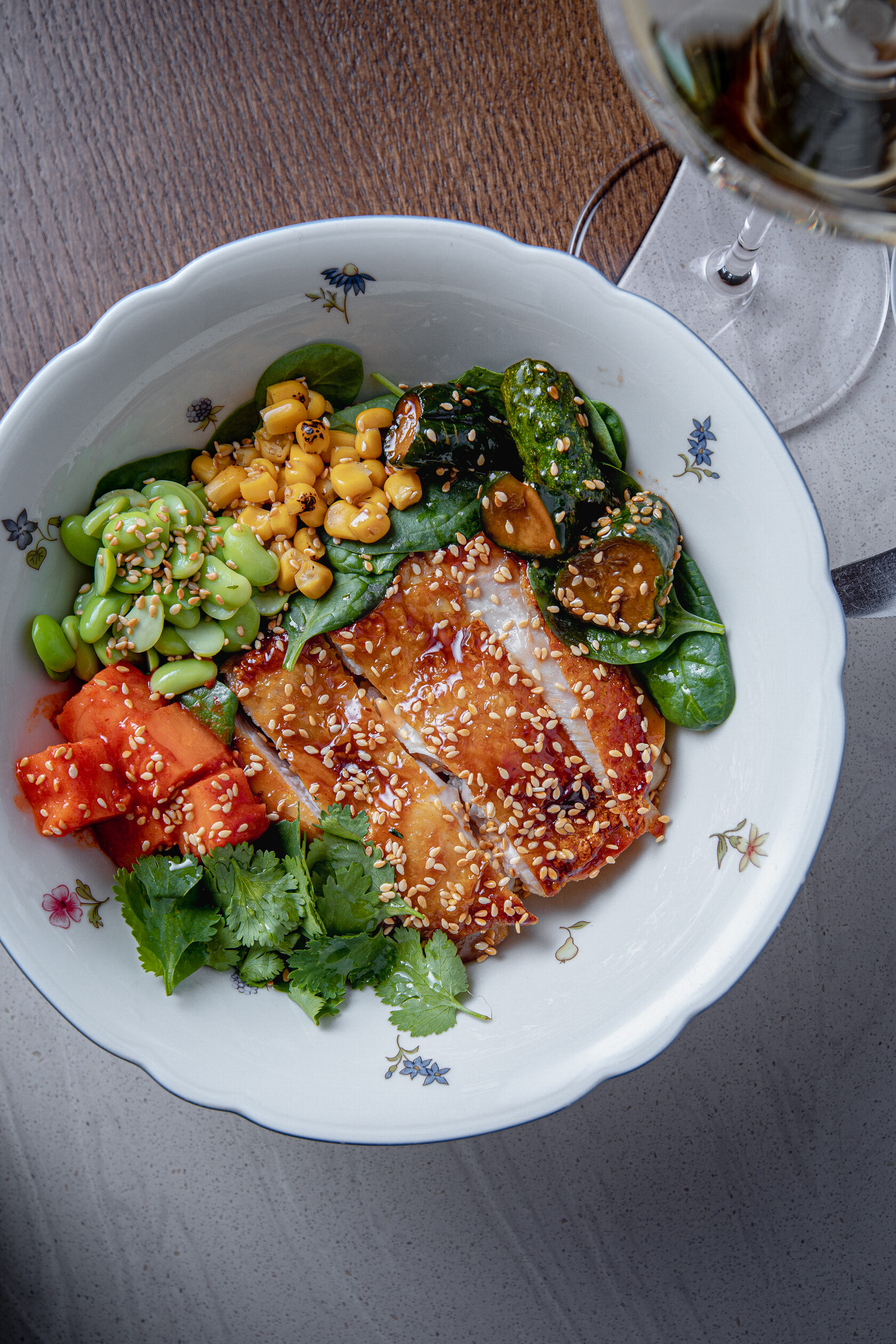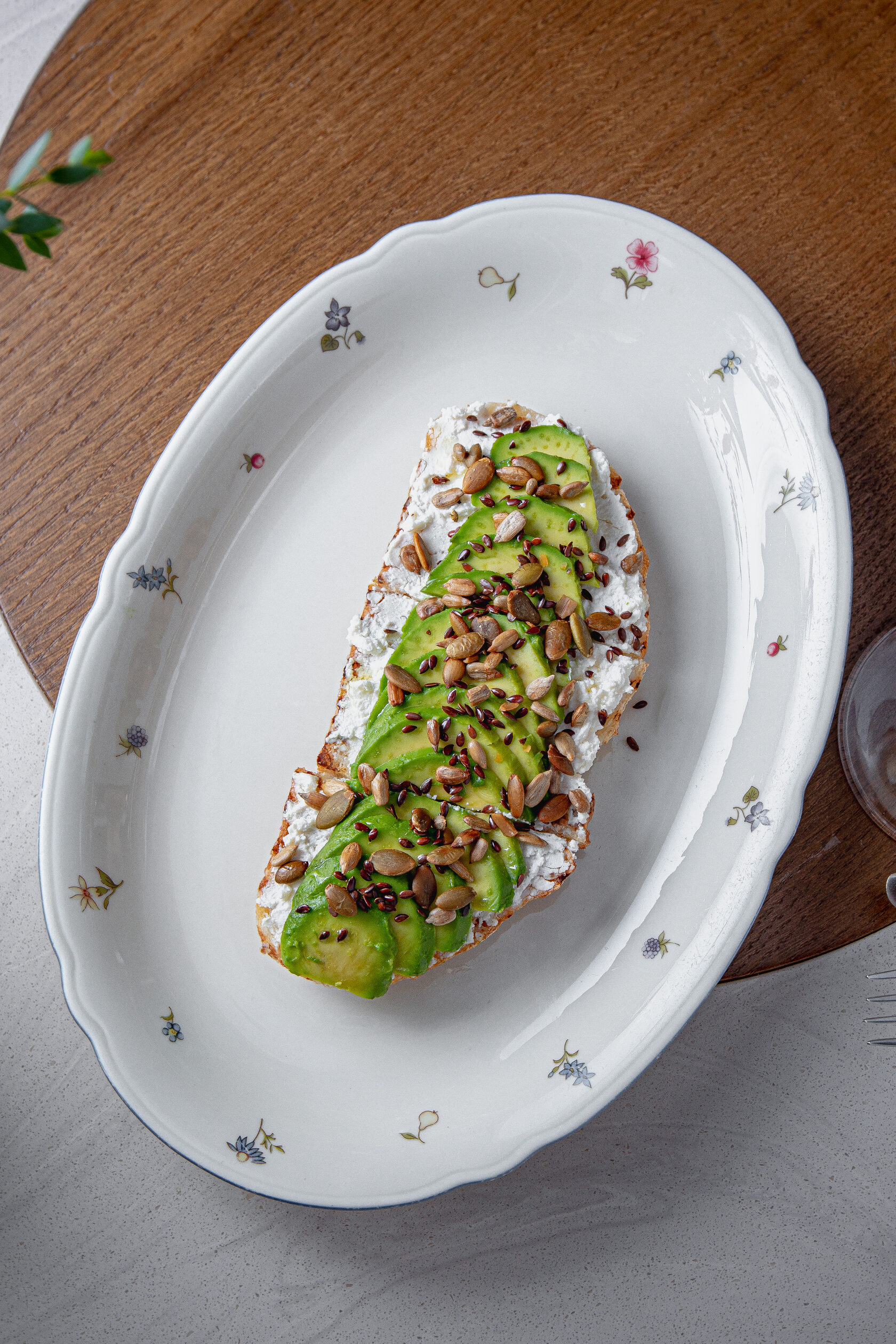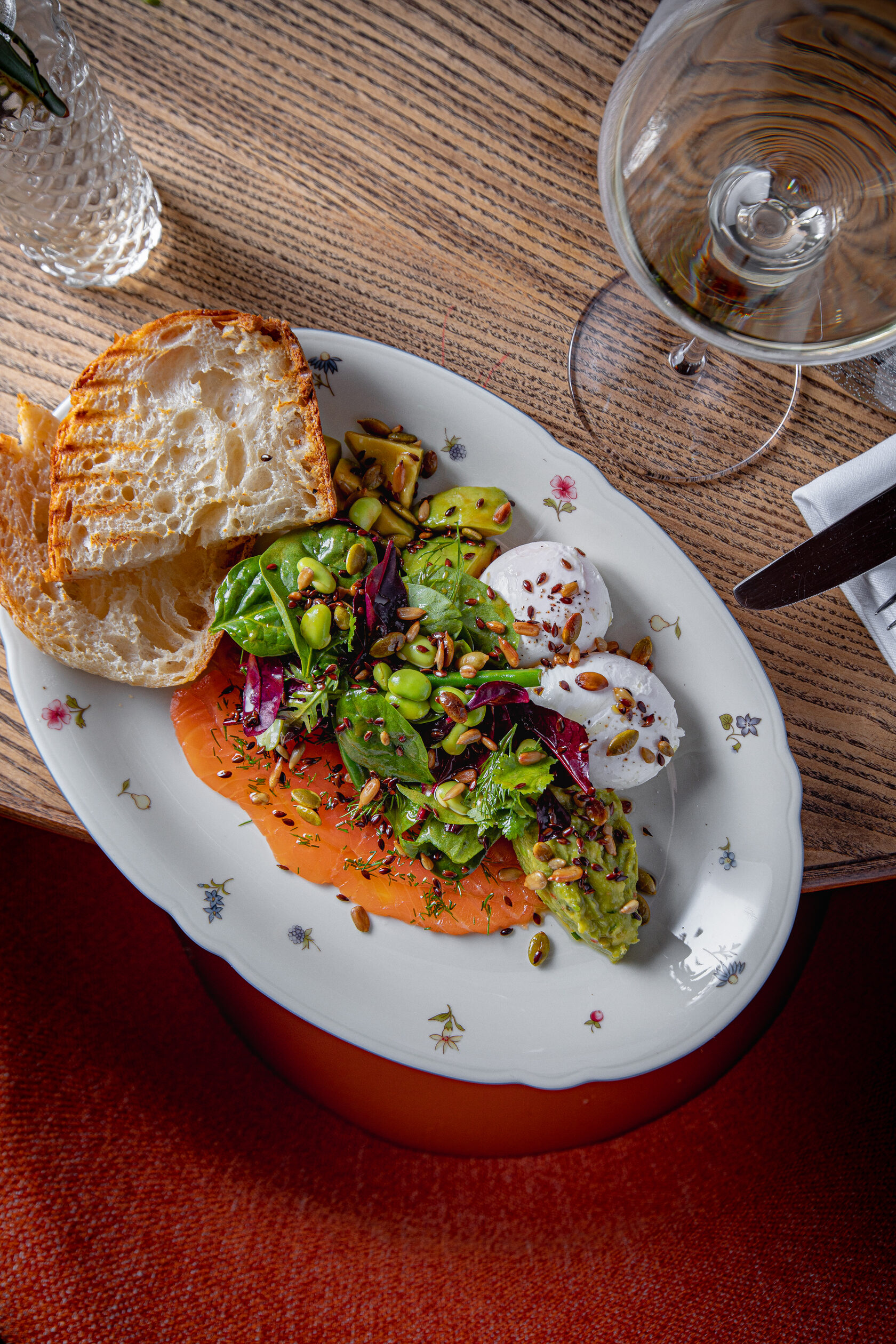 Завтрак AVA: яйцо пашот, гуакамоле, эдамаме, тосты лосось, яйцо пашот, гуакамоле, эдамаме, тосты